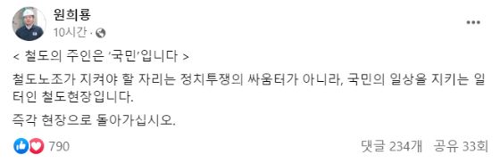 원 장관은 전날(14일) 본인이 페이스북에 "철도노조가 지켜야 할 자리는 정치투쟁의 싸움터가 아니라 국민의 일상을 지키는 일터인 철도 현장"이라며 "즉각 현장으로 돌아가라"고 작성했다.