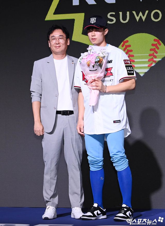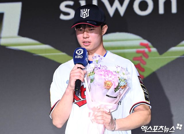 떨리는 마음으로 무대 위에 선 원상현은 "KT 위즈에 입단하게 돼 기쁘다. 고등학교 1학년 때 마무리를 하다가 소형준 선배님을 보면서 선발투수를 하고 싶다는 생각을 하게 됐다"라며 "소형준 선배님처럼 선발투수로 성장해 KT의 미래가 되도록 하겠다. 또 미래에 팀과 리그를 대표하는 선수가 될 수 있게 노력하겠다"고 당찬 포부를 밝혔다.