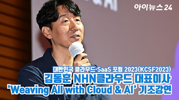 김동훈 NHN클라우드 대표이사가 지난 14일 서울 영등포구 여의도동 전경련플라자 그랜드볼룸에서 열린 '대한민국 클라우드·SaaS 포럼 2023(KCSF2023)'에서 'Weaving All with Cloud & AI'을 주제로 기조강연을 하고 있다. [영상=문수지 기자]
