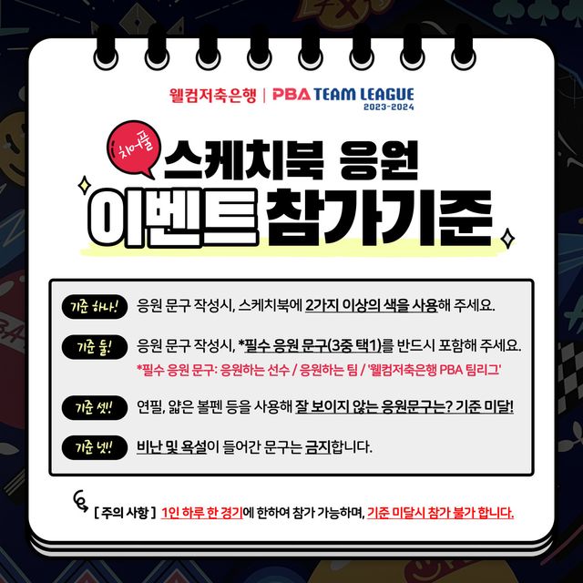 응원 문구를 작성할 때는 ▲ 스케치북에 2가지 이상의 색을 사용 ▲ 필수 응원 문구(응원하는 선수/응원하는 팀/ '웰컴저축은행 PBA 팀리그' 3중 택1) 반드시 포함 ▲ 연필, 얇은 볼펜 등 사용 금지 ▲ 비난 및 욕설 금지 등의 기준에 따라야 한다.