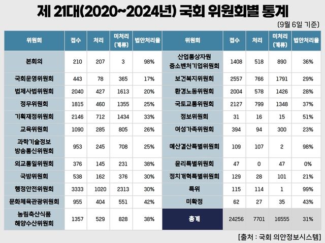 국회 의안정보시스템에 따르면, 9월 6일 기준 21대 국회 의안이 접수된 건수는 총 2만4256건, 처리 건수는 7701건, 미처리(계류) 건수는 1만6555건이다. 위원회 총 의안처리율은 31%에 달했다. 정치권에 따르면, 의안이 발의되고 처리되기까지 각 안건에 따라 다르지만, 평균적으로 1년 안에 처리돼도 빠른 편에 속한다.