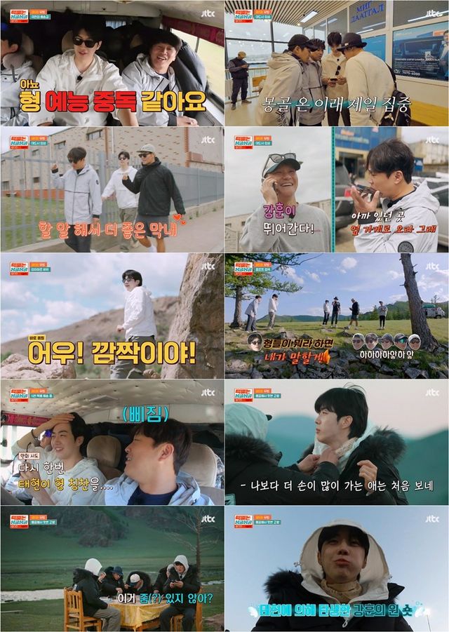 차태현의 반격도 이어졌다. 심약한 강훈을 일부러 놀라게 하는가 하면, 홍경인이 차태현이 가진 '사람 좋은 형' 캐릭터와 웃음소리가 부럽다며 칭찬을 하는 가운데 강훈이 대화에 집중하지 않는 듯하자 차태현이 "너 왜 형 칭찬하는데 리액션이 없냐"며 장난스레 면박을 줘 웃음을 유발하기도 했다. 반면 차태현은 추위에 바들바들 떨고 있는 강훈에게 "나보다 손 많이 가는 애는 처음 본다"라고 말하며 목 스카프를 둘러주는가 하면 강훈을 위해 원샷 카메라까지 직접 세팅해 주며, 마치 막내 아들을 챙기는 아빠처럼 강훈을 살뜰히 챙겨 따뜻한 미소를 자아냈다. 이처럼 용띠 형들과 강훈이 날이 갈수록 끈끈한 케미와 관계성을 뽐내고 있는 가운데, 몽골 택배 여행의 중반을 지나온 여섯 남자가 남은 여정 동안 어떤 모습을 보여줄 지 귀추가 주목된다.