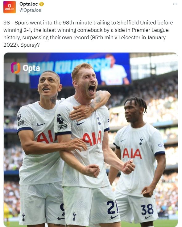 '옵타'는 "토트넘은 98분에 2-1로 승리하기 전까지 뒤지고 있었다"라며 "토트넘이 자신들의 기록(2022년 1월 레스터 시티전 95분)을 뛰어넘으면서 프리미어리그 역사상 극적인 역전승이 돌아왔다"라고 설명했다.