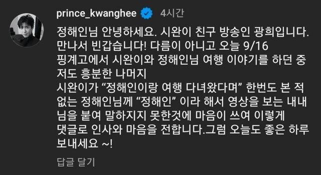이어 “다름이 아니고 오늘 9/16 ‘핑계고’에서 시완이와 정해인 님 여행 이야기를 하던 중 저도 흥분한 나머지 시완이가 “정해인이랑 여행 다녀왔다”며 한 번도 본 적 없는 정해인 님께 “정해인”이라고 해서 영상을 보는 내내 님을 붙여 말하지 못한 것에 마음이 쓰여 이렇게 댓글로 인사와 마음을 전합니다”라고 상황을 설명하며 사과했다.