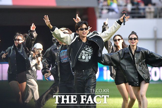 가수 임영웅이 지난 4월 8일 오후 서울 마포구 서울월드컵경기장에서 '하나원큐 K리그1 2023' FC서울과 대구FC의 경기 축하공연을 하고 있다. /남윤호 기자