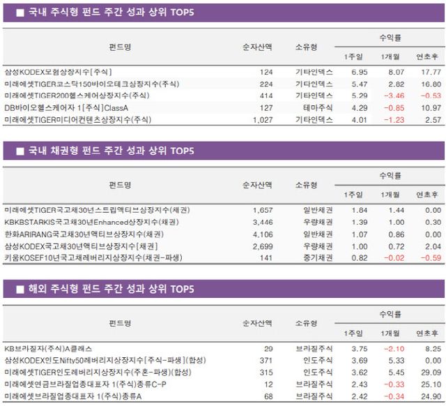 17일 펀드평가사 KG제로인에 따르면 순자산액(클래스 합산) 100억원 이상, 운용기간 1개월 이상인 국내 주식형 펀드 중 주간 수익률(9월 8~14일) 기준 ‘TIGER 코스닥150바이오테크’ ETF가 주간 수익률 5.47%로 1위를 기록했다. ‘TIGER 200헬스케어’ ETF는 5.29%, ‘DB바이오헬스케어자1’ 펀드는 4.29%로 5위권에 모두 이름을 올렸다.