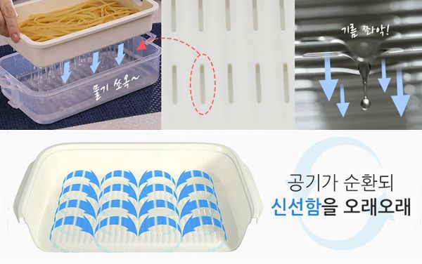 과학적으로 디자인된 다용도 채반 용기로 눅눅함을 빼고 바삭함을 잡아준다. 물기와 기름기를 아래로 배출하고 공기가 순환되는 방식으로 바삭함을 오랫동안 유지한다.