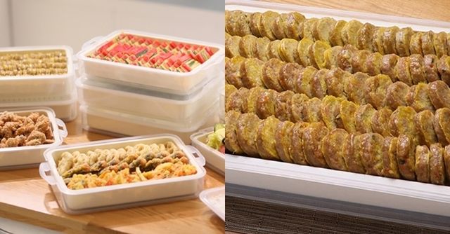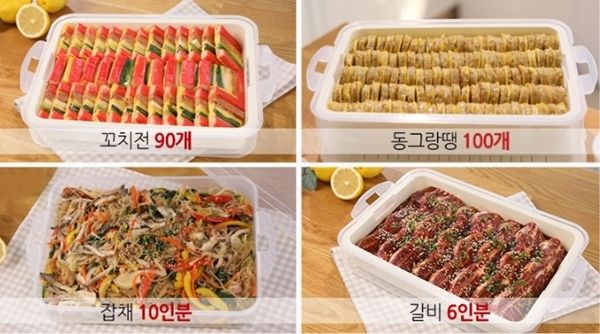 꼬치전 90개, 동그랑땡 100개, 잡채 10인분이 들어가는 3,500ml 초특대형 용량이다. 1600ml는 용기 절착이 가능해 냉장고에 보관하기도 편리하다.