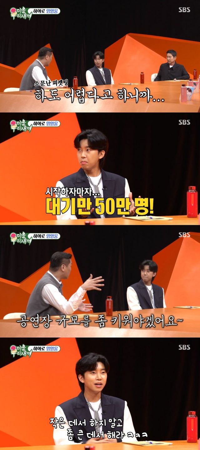 또한 이날 방송에서 그는 자신의 콘서트 티켓팅에 직접 참여해 본 후기를 전하기도 했다. 임영웅의 콘서트는 일명 '피켓팅(피나는 티켓팅)'이라고 불릴 정도로 치열한 티켓팅으로 잘 알려져 있다. 그는 얼마나 치열한지 직접 티켓팅해 보려다가 시작과 동시에 대기자 50만명인 것을 보고 아예 도전할 엄두를 못 냈다고 했다.
