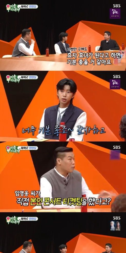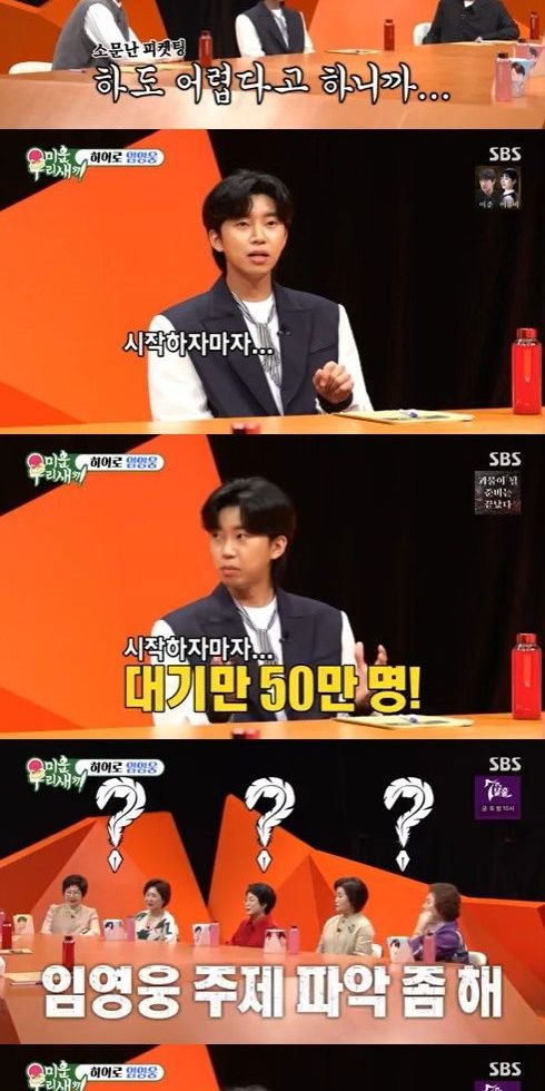 뉴스1에 따르면 임영웅은 '자식들이 임영웅 콘서트 티켓을 구해주면 효자, 효녀 소리를 듣는 게 어떠냐'는 질문을 받고 "기분 좋고 감사하다"라고 했다. 이어 직접 티켓팅에 도전해보기도 했다며 "하도 어렵다고 하니까 얼마나 어려운가 하고 해봤는데, 시작하자마자 대기가 50만 명이라 기다릴 수가 없더라"라고 덧붙였다.