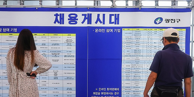 在首尔广津文化艺术中心举行的就业博览会上,求职者们在查看招聘公告栏 【图片提供 韩联社】