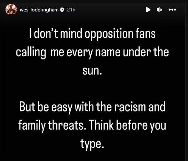 '데일리 메일'에 따르면, 이날 추가시간이 2골을 실점하기 전까지 좋은 선방을 여러 차례 보여줬던 포더링엄은 경기가 끝난 뒤 자신의 SNS에 "난 상대팀 팬들이 내 이름을 불러도 신경 쓰지 않지만, 인종차별과 내 가족을 향한 위협은 다르다. 타자를 치기 전에 생각해라"라고 작성했다.