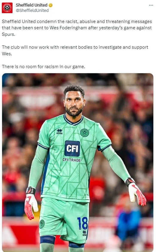 영국 매체 '데일리 메일'은 18일(한국시간) "셰필드 유나이티드와 토트넘 홋스퍼는 셰필드 골키퍼 웨스 포더링엄이 받은 인종차별을 규탄했다"라고 보도했다.