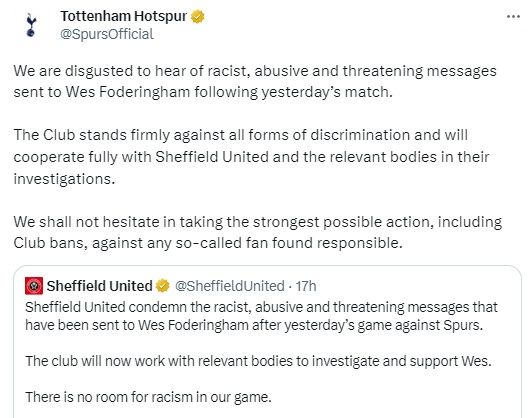 해당 소식을 접한 토트넘도 "우리는 포더링엄에게 인종차별적인 욕설과 위협적인 메시지를 보냈다는 걸 들었다는 사실이 역겹다"라며 "우린 모든 형태의 차별을 단호히 반대하며, 셰필드와 관련 기관들의 조사에 전적으로 협조할 것"이라고 성명문을 발표했다.
