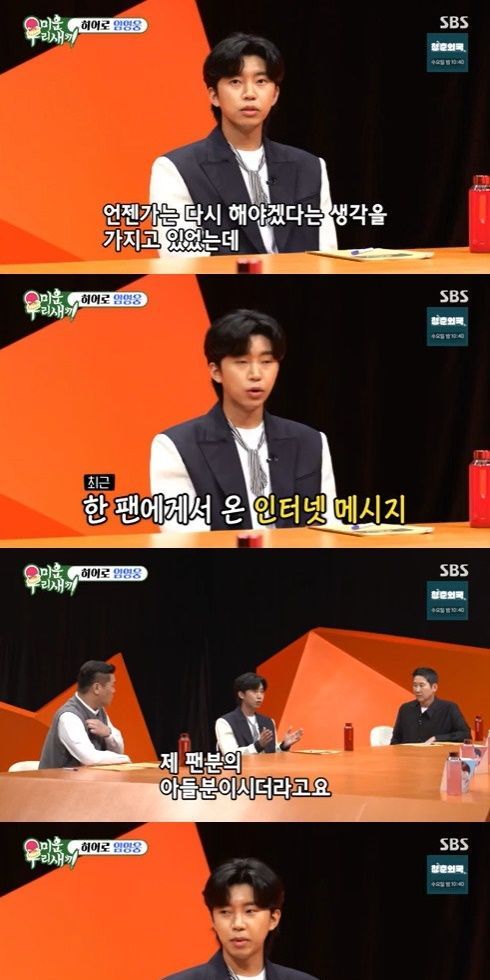 뉴스1에 따르면 임영웅은 "예능이 어렵지만 다시 시작해야겠다고 생각하고 있었는데, 최근에 팬의 아드님이 메시지를 보내셔서 '어머니가 팬이신데 영웅씨가 TV에 나오기만 기다리다가 병으로 돌아가셨다'라고 하더라"라며 "그런 메시지가 한 두 개가 아니어서 방송에 나가야겠다고 생각했다"라고 말했다.