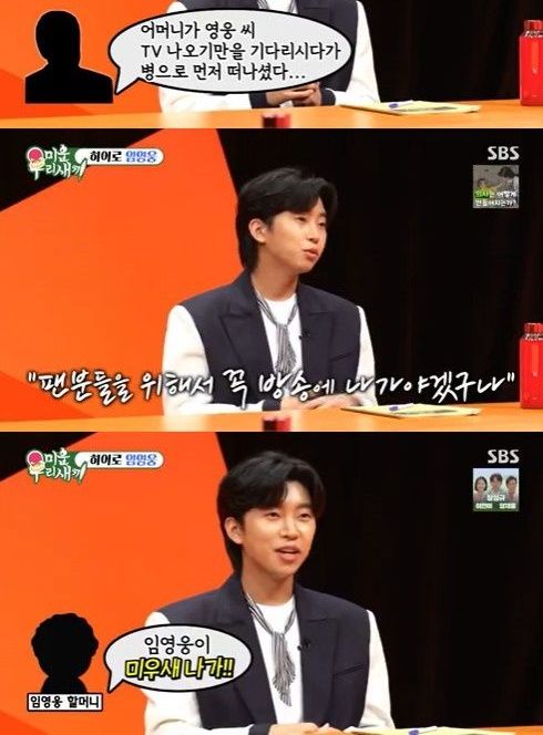 이어 "그때 할머니께서 '임영웅이 미우새 나가, 미우새'라고 하시고, 마침 섭외를 해주셔서 나오게 됐다"라고 덧붙였다.