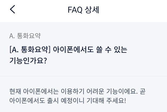 18일 업계에 따르면 SK텔레콤은 현재 안드로이드 스마트폰에서만 지원하는 에이닷 통화요약 기능을 아이폰으로 확장하기 위한 준비에 나섰다. 현재 에이닷 앱 FAQ 메뉴는 "현재 아이폰에서는 (통화 요약이) 이용하기 어려운 기능"이라면서도 "아이폰에서도 출시 예정이니 기다려 달라"고 안내돼 있다.