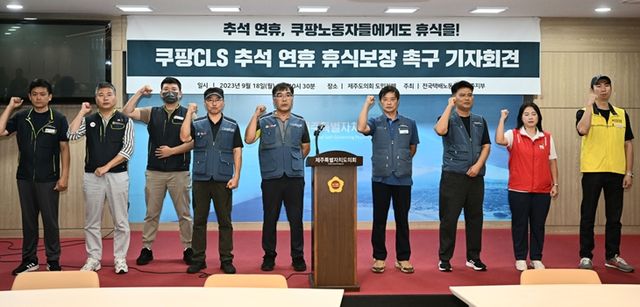 택배노조는 18일 제주도의회 도민카페에서 기자회견을 열고 "쿠팡 택배 노동자들은 황금 연휴는 물론이고 추석 당일에조차 쉬지 못하고 강제 배송에 내몰리고 있다"며 "추석 하루라도 쉬겠다면 '수행률 미달'로 해고를 각오해야 하는 기막힌 현실에 직면해 있다"고 주장했다.