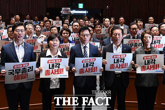 한편 윤 대통령에게 국무총리 해임과 내각 총사퇴를 요구하며 전면적인 인적 쇄신을 촉구했다. 박 원내대표는 "그것이 엉킨 정국을 풀기 위한 길이고, 국민과 소통을 시작하는 방법"이라며 "국민과 국회의 의견을 충분히 수렴해서 국민통합형 인물을 국무총리로 임명하라"고 요청했다.