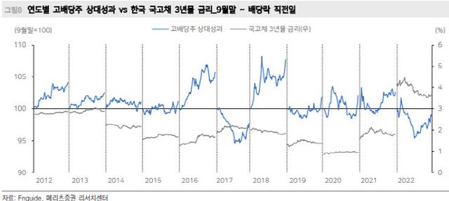 메리츠증권은 19일 배당주 투자 매력은 통상 4분기 이후부터 부각되기 시작하다고 짚었다. 연말 배당을 지급하는 종목이 다수이며, 분기배당 대비 주당배당액(DPS)이 크기 때문이다. 과거 고배당주(배당지급 종목 내 배당수익률 상위 10% 종목)의 4분기 이후 배당락일 전일까지의 코스피 전체 평균 수익률 대비 초과 성과는 2.0%포인트를 기록했다.