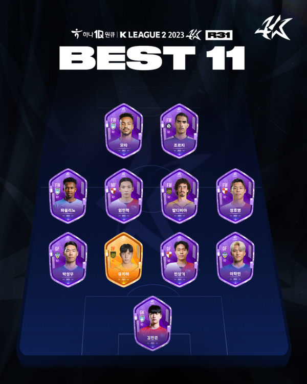 K리그2 32라운드 베스트11에는 모따, 파울리뇨, 김민준(이상 천안시티FC), 임민혁, 성호영, 민상기(이상 부산), 박성우, 이학민(이상 충남아산), 발다비아, 유지하(이상 전남), 조르지(충북청주FC)가 이름을 올렸다.