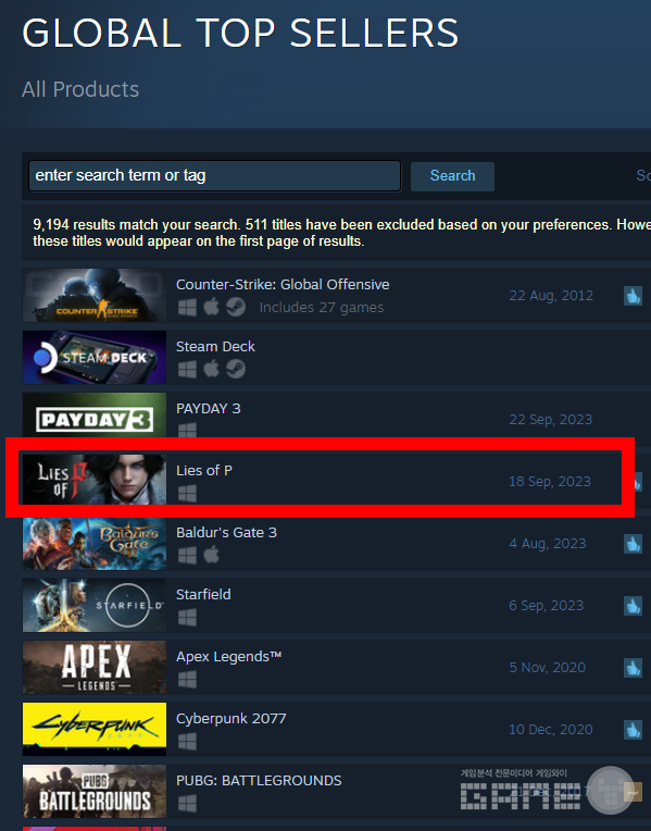 게임스컴 2022년 3관왕 'P의 거짓'이 스팀에 정식 출시됐다. 콘솔과 PC를 포함해 애플 실리콘을 탑재한 맥(Mac) 앱스토어에서도 즐길 수 있다. 19일 'P의 거짓'은 스팀 글로벌 판매 순위 차트에서 '발더스게이트3'와 '스타필드'를 제친 상태다.