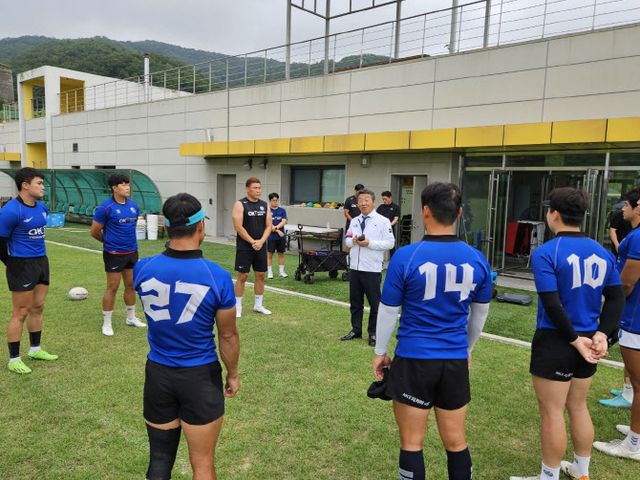 대한럭비협회 최윤 회장이 럭비 국가대표 선수들을 격려하고 있다. 사진=대한럭비협회