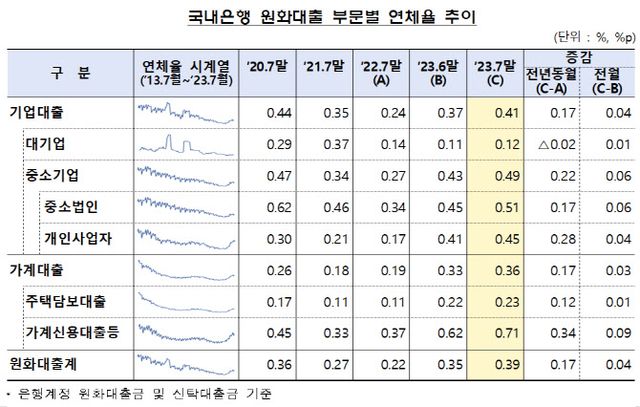 기업대출 7월 연체율(0.41%)은 전달(0.37%) 대비 0.04%포인트, 전년(0.24%) 대비 0.17%포인트 상승했다. 대기업대출 연체율(0.12%)은 전달(0.11%) 대비 0.01%포인트 상승했으며, 전년(0.14%) 대비 0.02%포인트 하락했다. 중소기업대출 연체율(0.49%)은 전월 말(0.43%) 대비 0.06%포인트, 전년(0.27%) 대비 0.22%포인트 뛰었다.