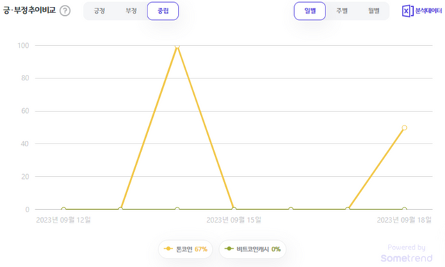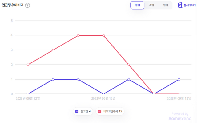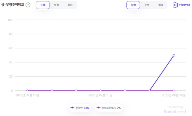 9월 12일부터 9월 18일까지 일주일간 톤코인은 4회, 비트코인캐시는 15회 언급됐다.