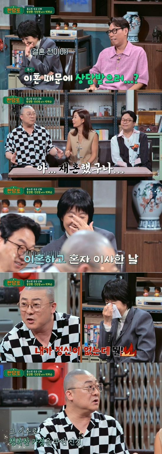 염경환은 "홍진경이 지금 남편이랑 당시에 좀 싸웠나 보다. 헤어질까 만날까 하는데 왜 나에게 이야기하는지 모르겠다"며 "나도 지난 이야기니 하는데, 그 전주에 제가 이혼을 했었다"고 폭탄 발언을 했다. 옆에서 이를 듣던 안선영은 "오빠 이혼했었냐. 재혼했구나"라며 염경환에게 놀라움을 표해 웃음을 안겼다.