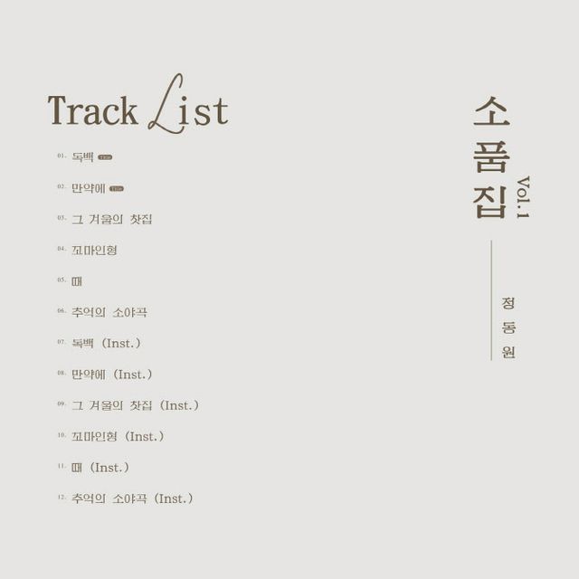 이번 신보에는 더블 타이틀곡 ‘독백’과 ‘만약에’를 비롯해 ‘그 겨울의 찻집’, ‘꼬마인형’, ‘때’, ‘추억의 소야곡’ 등 6곡을 수록했으며 각 곡의 연주곡 버전도 포함했다. 앞서 정동원은 지난 1일 쓸쓸한 감성이 돋보이는 곡인 ‘독백’을 선공개곡으로 먼저 들려준 바 있다.
