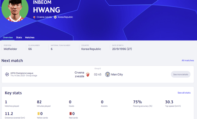 세르비아 명문 츠르베나 즈베즈다에 입단한 황인범은 20일(한국시간) 영국 맨체스터 에티하드 경기장에서 열린 2023/24시즌 UEFA 챔피언스리그 G조 1차전 맨시티와 원정 경기에서 등번호 66번을 달고 수비형 미드필더로 선발 출전해 후반 37분까지 분전한 뒤 교체아웃됐다. 황인범은 이날 공격형 미드필더 자리부터 최후방 수비까지 그라운드를 두루 누비면서 맨시티 선수들과 비교해 밀리지 않는 실력을 선보였다.