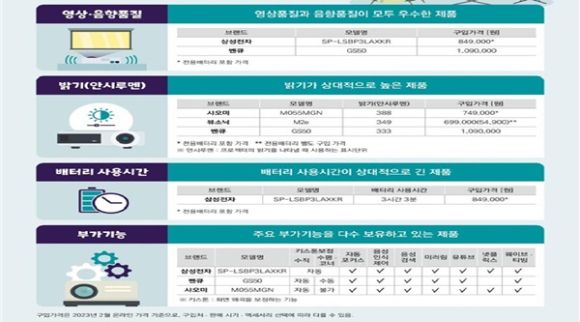 이와 함께 제품 작동 시 발생하는 '소음'은 36dB~43dB 수준으로 제품 간에 차이가 있었고, △삼성전자(SP-LSBP3LAXKR) △제우스(ZeusA1000N) △프로젝터매니아(PJM-MINI9) 등 3개 제품이 상대적으로 소음이 적은 것으로 나타났다.