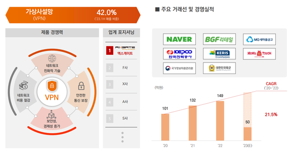 올해 상반기 기준 매출 비중의 42.0%를 차지하는 가상사설망의 경우, 국내에서 최상위 포지셔닝을 확보하면서 기존의 외산을 대체하고 있다는 설명이다. 주요 고객사로는 네이버(NAVER), BGF리테일, MG새마을금고, 한국전령공사, 국가정보자원관리원, 대한민국육군 등이 있다.