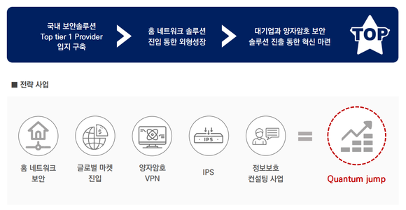 이어 "주력사업인 방화벽, 가상사설망 등 네트워크 보안솔루션 사업을 기반으로 정부 주도 전략사업인 홈 네트워크 보안 및 양자암호보안 시장으로 사업영역을 확대하고 시장 내 확고한 상위 포지션을 구축해 나갈 계획"이라고 설명했다.