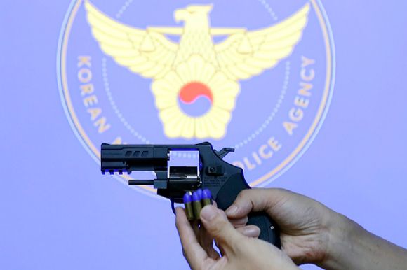 경찰청이 29일 서울 서대문구 본청에서 저위험 권총을 공개하고 있다. 내년부터 강력범죄 대응력을 높이기 위해 살상력을 낮춘 저위험 권총이 모든 현장 경찰들에게 지급된다. (위 사진은 기사 내용과 무관함)[사진=뉴시스]