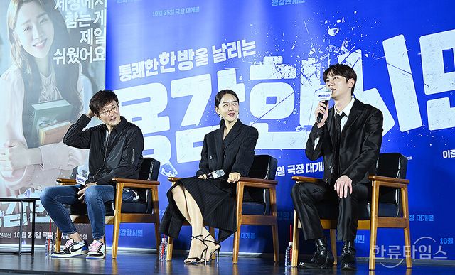 배우 신혜선, 이준영, 박진표 감독이 21일 오전 서울 광진구 롯데시네마 건대입구점에서 열린 영화 '용감한 시민' 제작보고회에 참석해 취재진의 질문에 답하고 있다.