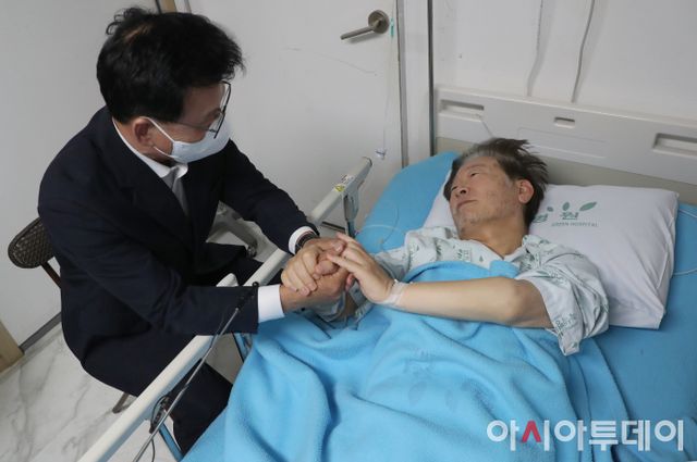 박광온 더불어민주당 원내대표가 21일 서울 중랑구 녹색병원에서 단식 중인 이재명 대표를 찾아 대화하고 있다. 이날 오후 이 대표의 체포동의안이 본회의에서 표결에 부쳐진다. 이 대표는 전날(20일) 페이스북을 통해 직접 부결을 요청했다. /국회사진취재단