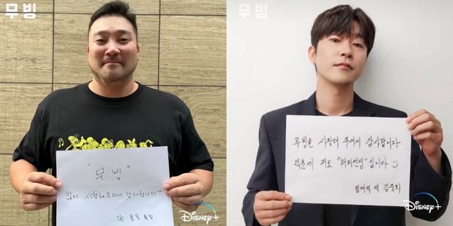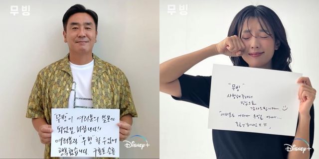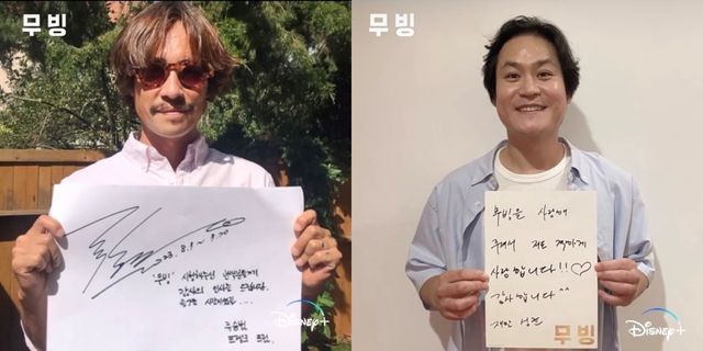 '무빙'에 등장한 배우 김도훈(왼쪽)과 박희순(오른쪽)이 종영 소감이 담긴 메시지를 들고 미소 짓고 있다. / 디즈니+ 공식 인스타그램