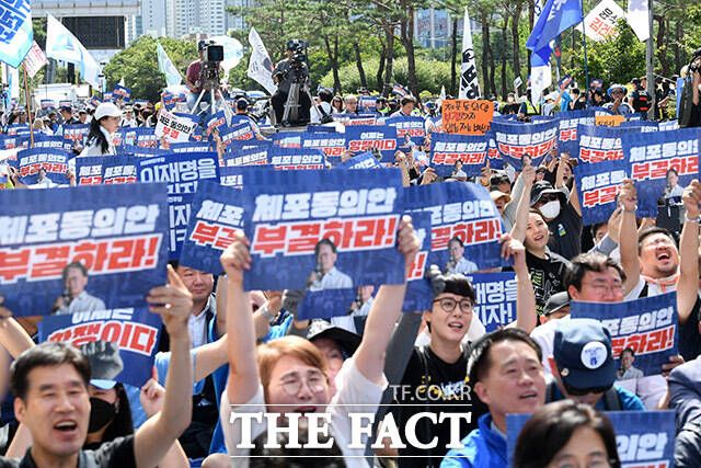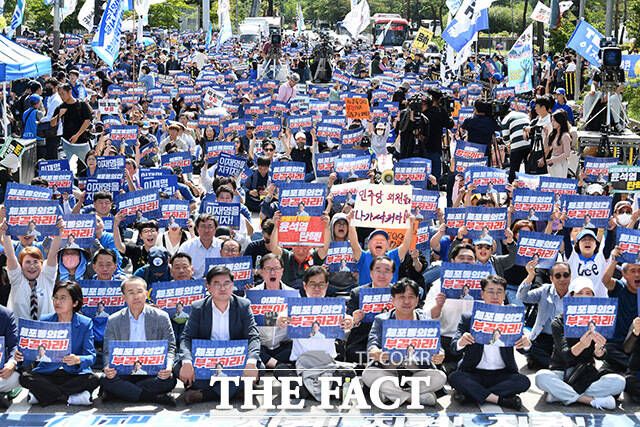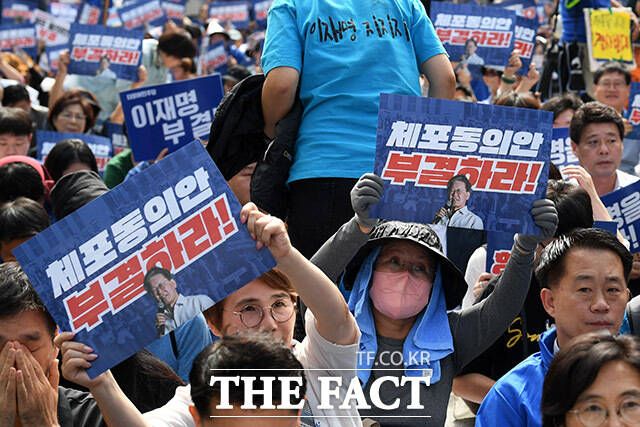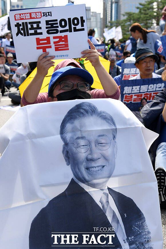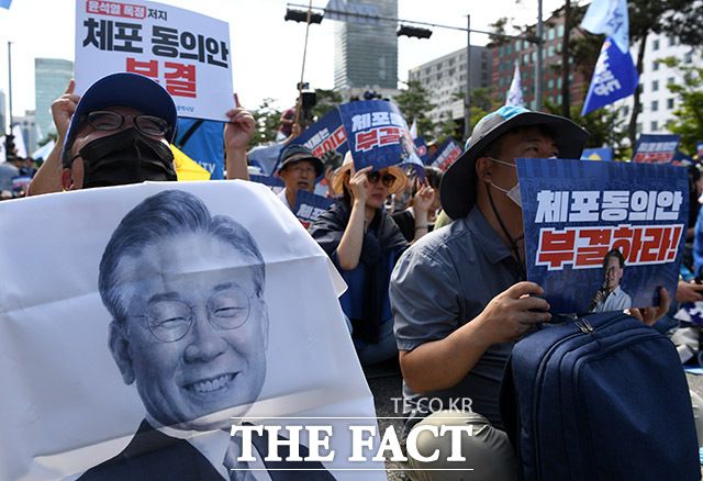 [더팩트ㅣ남용희 기자] 이재명 더불어민주당 대표 체포동의안 표결을 앞둔 21일 오전 서울 여의도 국회 앞에서 이 대표 체포동의안 부결 촉구 집회가 열린 가운데 참가자들이 손피켓을 들어보이며 구호를 외치고 있다.