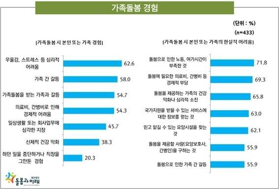 사정이 이렇다 보니 가족 돌봄으로 인해 '우울감·스트레스 등 심리적 어려움'을 겪었다는 응답자가 62.6%나 됐다.