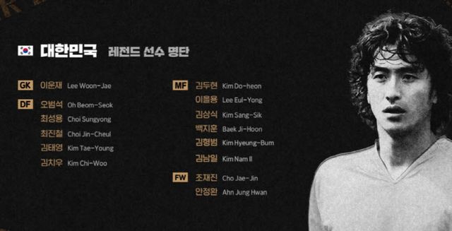 ‘대한민국 레전드’는 2002 한일 월드컵 4강 신화‘ 주역들이 주축을 이룬다. 공격수는 안정환과 조재진이 나선다. 미드필더는 김두현, 이을용, 김상식, 백지훈, 김형범, 김남일로 구성됐다. 수비수는 오범석, 최성용, 최진철, 김태영, 김치우가 나서고 골키퍼는 이운재가 맡는다.