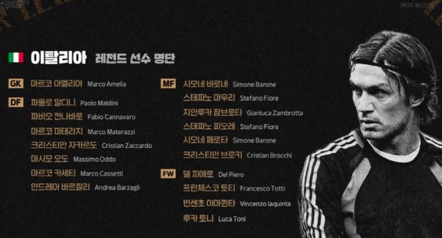 ‘이탈리아 레전드’ 팀도 화려함 그 자체다. 알레산드로 델 피에로, 프란체스코 토티, 루카 토니, 빈첸초 이아퀸타가 공격을 책임진다. 미드필더는 잔루카 참브로타, 시모네 바로네, 스테파노 마우리, 스테파노 피오레, 시모네 페로타, 크리스티안 브로키가 나선다. 수비진은 파비오 칸나바로, 파울로 말디니, 마르코 마테라치, 마시모 오도, 마르코 카세티, 안드레아 바르찰리, 크리스티안 차카르도 등 이탈리아 국가대표 출신들이 이름을 올렸다. 골문은 마르코 아멜리아가 지킨다.