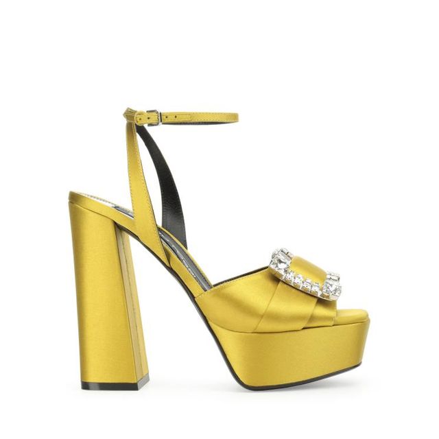 샌들 힐을 제안한다. 발등을 감싸는 화려한 크리스털 장식과 군더더기 없는 실루엣, 그리고 옐로와 그린 컬러 사이인 듯 오묘한 빛을 발하는 샤르트뢰즈 컬러의 조합이 이색적이다.
