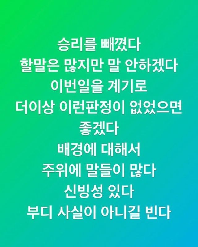정 부회장은 "승리를 빼겼다. 할 말은 많지만 말 안 하겠다. 이번 일을 계기로 더 이상 이런 판정이 없었으면 좋겠다. 배경에 대해서 주위에 말들이 많다. 신빙성이 있다. 부디 사실이 아니길 빈다"라며 격정을 토로했다.