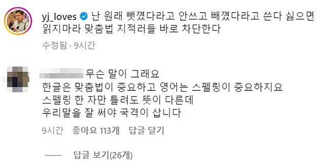 그러자 정 부회장은 "난 원래 뺏꼈다라고 안 쓰고 빼꼈다라고 쓴다. 싫으면 읽지 말라. 맞춤법 지적러들 바로 차단한다"라는 댓글을 달았다.