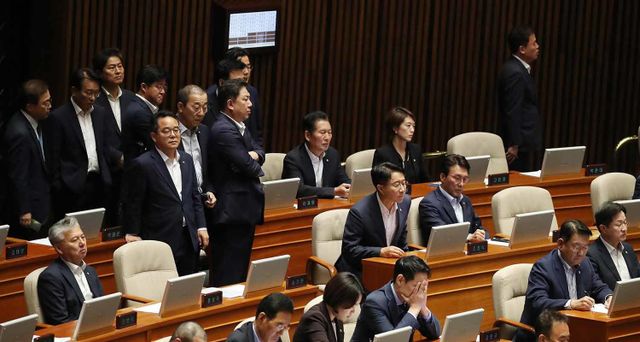 더불어민주당 의원들이 21일 오후 서울 여의도 국회에서 열린 제410회 국회(정기회) 제8차 본회의에서 이재명 대표에 대한 체포동의안이 총투표수 295표, 가 149표, 부 136표, 기권 6표, 무효 4표로 가결되자 아쉬워하고 있다. / 뉴스1
