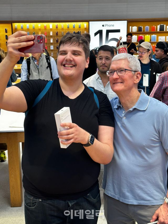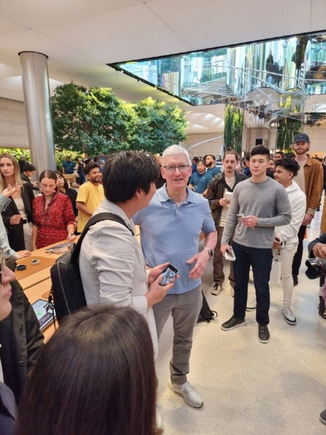 그런데 한쪽에 하늘색 셔츠를 한 팀쿡이 있었다. 자리를 떠나지 않고 아이폰 유저들과 아이폰15 출시 기쁨을 나누고 있었던 것이다. 고객이 가져온 흰색 아이폰15 박스에 사인을 직접해주며 셀피 촬영을 이어나갔다. 그만큼 아이폰15 판매에 신경을 쓰고 있다는 느낌이 들었다.