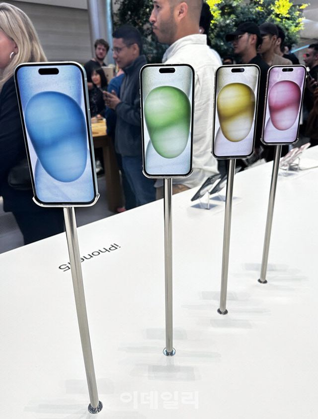 팀쿡과 짧은 인터뷰를 끝내고 애플스토어 곳곳에 있는 아이폰15를 살펴봤다. 일반·플러스 모델은 핑크·옐로·그린·블루·블랙 색상으로 나왔는데 파스텔톤의 화사한 느낌이 들었다. 기능은 전작인 아이폰14프로와 비슷한 만큼 상대적으로 저렴한 가격에 새로운 수요를 끌어올릴 수 있을 느낌이 들었다.