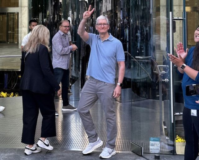 하지만 팀 쿡은 쉽게 문을 나오지 못했다. 직원의 실수로 한쪽 문이 잠겨 있었기 때문이다. 멋쩍은 표정을 하며 앉아 자물쇠를 풀려고 했지만 쉽게 열리지 않았다. 현장에서는 “팀 쿡 그냥 나와요”고 대기자들이 외쳤다. 겨우 문을 열고 나온 팀쿡은 늘 그러했듯이 두손을 모아 기도하는 자세를 취하고 ‘오픈런’ 대기자들을 향해 손을 흔들며 이들을 맞이할 준비를 했다.